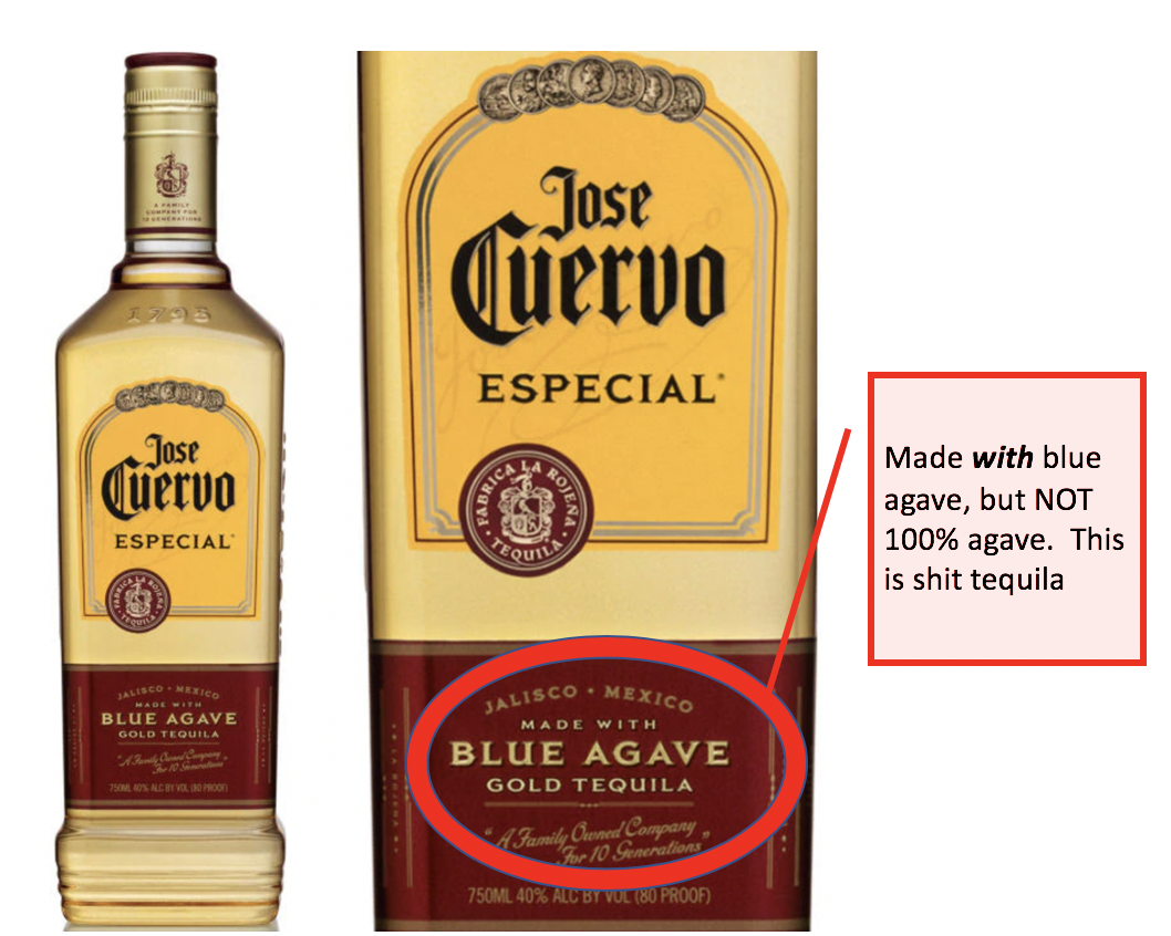 Before we examine what good tequila is, let's examine what Jose Cuervo Gold is (spoiler alert: it's not good). Cuervo Gold and other cheap tequilas are a type of tequila called mixto. Mixto type tequila must be at least 51% alcohol from agave, with the remaining content coming from . . . where ever - grains, sugars, etc.