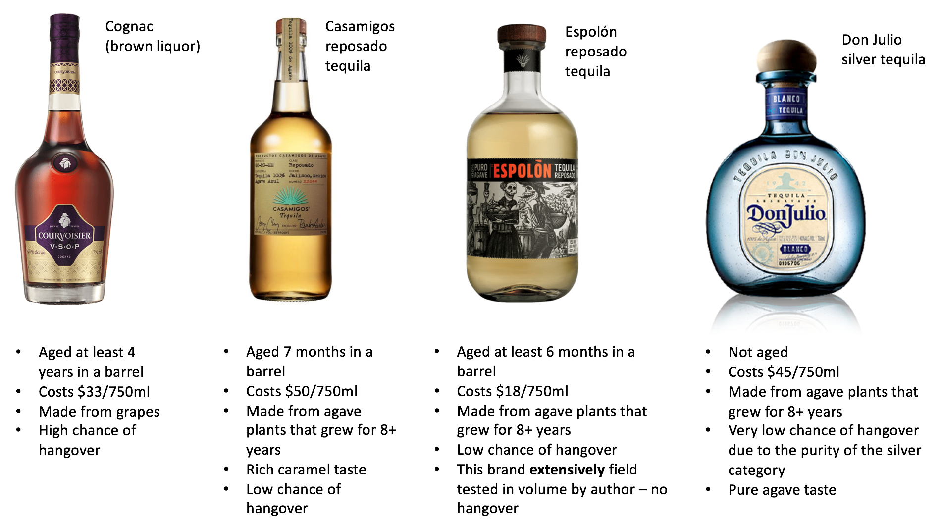 The añejo and ultra añejo tequilas, since they are aged in barrels for years, will start to take on more characteristics of the brown liquors (and less from the agave plant) specifically because they are aged in barrels for much longer than silvers and reposados. The picture below compares some aspects of a cognac and a few tequilas, including the aging and cost.
